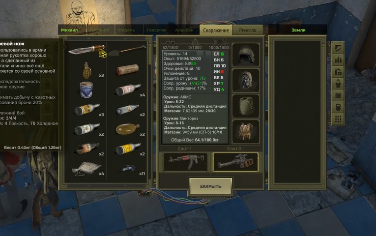 Не так эффективны и универсальные, как автоматы, так как большая часть боев в игре происходит именно на близких и средних дистанциях. Однако, по убойности им нет равных. Лучшая винтовка – ПТРД, где урон за выстрел достигает 45. Для использования требуется навык в 95, сила в 8. На втором месте стоит винтовка ВВЭ, с уроном до 40.