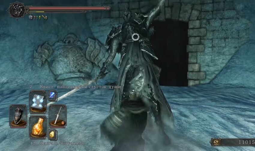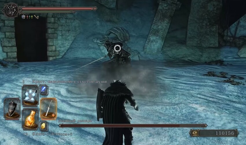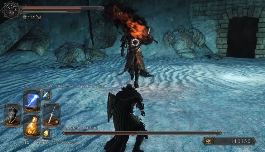 Непонятно, можно ли перекувыркнуться через горизонтальную магию, когда он так водит мечом из стороны в сторону. Это очень опасно. Можно умереть много раз, прежде чем убить Дымного рыцаря и потерять много душ. Если гулять по локации и думать, что его можно ослабить, то ничего не получится. Он таким и остается, особенно на новой игре +. Может быть на обычной версии игры его можно пройти и не заметить, но на новой игре «плюс» он просто уничтожает вас.