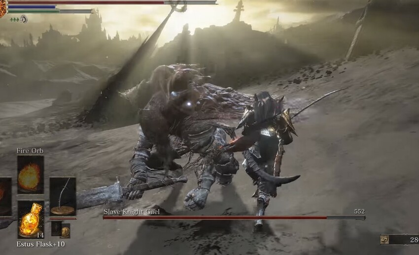 После начала боя босс обычно совершает удар мечом, заряженным аурой. Во время удара Гаэль далеко передвигается, поэтому нужно после удара откатиться назад. В итоге вы очутитесь там, где рыцарь приземлится, и можно несколько раз ударить.