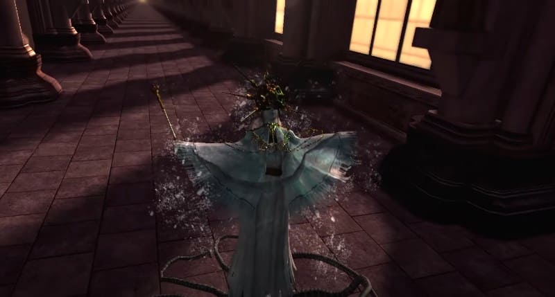 Опять Гвиндолин выражает недовольство, что-то бормочет. Он любит побеседовать, выражает угрозы, отправляет проклятья на нас. Босс решил испугать нас очень длинным коридором. Однако он для нас не страшен, и не может создать никакого особого впечатления. У босса осталось только 3 атаки, а также бесконечная телепортация. Всегда, когда мы приближаемся, он уходит дальше и извергает стрелы и магию. От его всех атак можно быстро уйти. Можно просто отпрыгнуть в сторону. Также можно закрыться, либо зайти за колонну. Прежде всего, нужно подобраться к боссу ближе и успеть ударить несколько раз, пока он занимается телепортацией. Только в этот момент его легко победить.