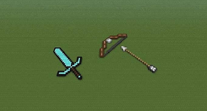 Оружие в Майнкрафте для ближнего боя — это меч. Он может быть как деревянным, так и алмазным. Все зависит от ресурсов, которыми располагает персонаж. Создание такого оружия в Майнкрафте, как меч, не занимает много времени и ресурсов. Для крафта нам понадобится одна деревянная палка и две единицы материала. в центральную нижнюю ячейку ставим палку, а над ней два железных слитка, располагающихся друг за другом.