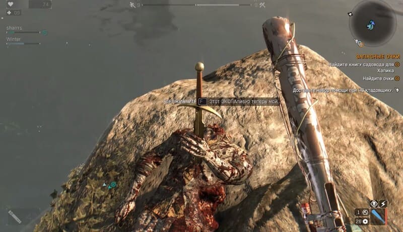 Интересный эффект при использовании меча – иногда откидывает врагов очень далеко, добавляя 50 очков ловкости и силы. Если попытаться бросить оружие в зомби или выбросить его на землю, снова поднять меч не получится.
