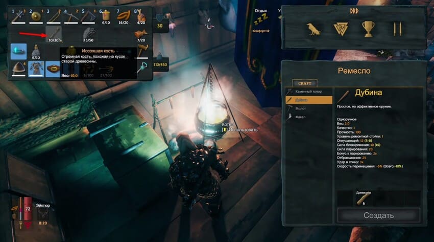 Понадобится оружие с хорошим уроном. Например, булава, которую можно скрафтить из: