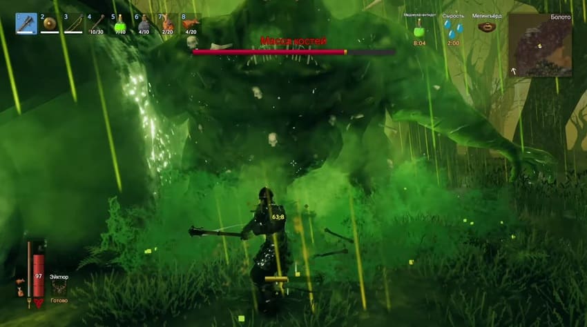 Масса костей – третий босс в Valheim, который находится в локации Болота. Для призыва нужно найти и активировать вельгезир, а потом принести к отмеченному на карте месту 10 костей. Победить чудовище можно в ближнем бою или с помощью лука. В награду за прохождение босса дают его душу. Она помогает искать клады и залежи руды.