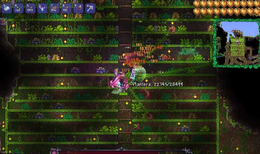 Плантера — сложный босс, тем более что окружение подземных джунглей довольно враждебно. Мало того, что она дропает изрядное количество оружия, вы также можете получить его из сундуков биома в подземелье. Этот бой с боссом уникален и сложен, не расстраивайтесь из-за неудачных нескольких попыток, он, безусловно, требует сильного владения скилов движения и концентрации.