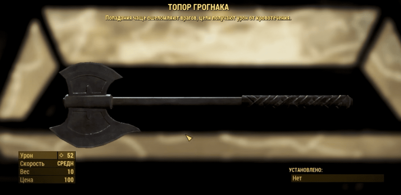 Секира, которая больше подошла бы игре в фентезийном сеттинге. Согласно игровой легенде, этот топор — реплика оружия, принадлежавшего Варвару Грогнаку, герою комиксов в мире Fallout. Чтобы завладеть топором, нужно взломать витрину на первом этаже торгового комплекса Хьюбрис Комикс, недалеко от чучела обезьяны.