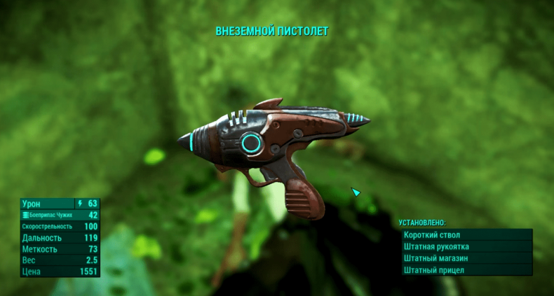 Уникальное оружие, которое можно найти в пещере недалеко от места падения летающей тарелки. Владелец, инопланетянин, еще жив и враждебно настроен к главному герою. Пистолет наносит довольно высокий энергетический урон. Можно модифицировать, и тогда в качестве боеприпасов оружие будет использовать обычные ядерные батареи.
