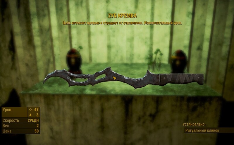 Уникальный предмет. Имеет более высокий урон по сравнению с обычными ножами, в том числе крафтовыми. Зуб Кремба можно найти в локации Данвичские бурильщики недалеко от Музея ведьм Салема, в самом северо-востоке мировой карты. При нахождении в этой местности вашему персонажу явится видение с колодцем. Нож можно найти, нырнув туда. Предварительно нужно снять тяжелую броню, если вы ее носите, иначе персонаж застрянет и вы не сможете вытащить Зуб Кремба через узкий проход.