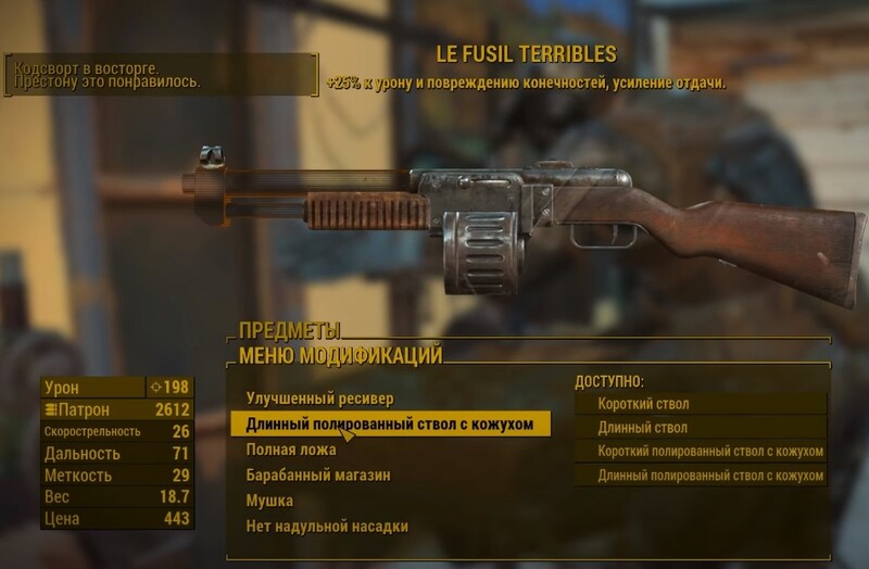 «Грозный дробовик» — уникальная модификация боевого дробовика, принадлежащая Проводу, главарю рейдеров в локации Либерталия. Легендарное свойство — дополнительный 25% урон по конечностям благодаря усилению отдачи. Во всем остальном Le Fusil Terribles идентичен стандартному боевому дробовику. Можно найти на Либерталии в капитанской рубке.