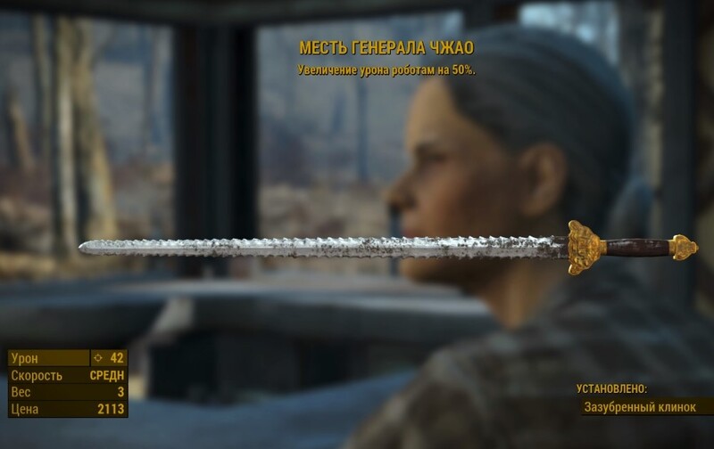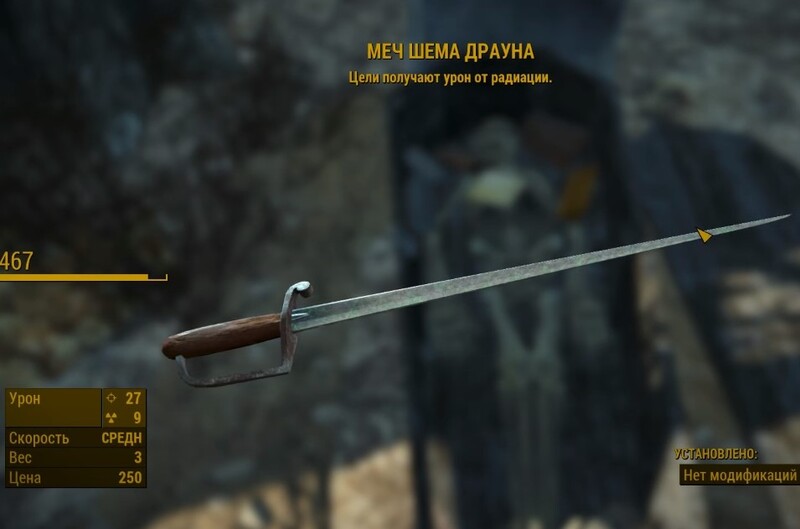 Уникальное оружие — немного нетипичный офицерский меч с зазубренным лезвием. Базовый урон у него выше, чем у прототипа. Легендарное свойство меча — на 50% увеличенный урон по роботам. Для владения этим оружием нужно прокачать силу. Найти оружие можно в закусочной «Друмлин» на северо-западе Бостона. Предмет продается у НПС Труди, которой постоянно досаждают рейдеры.