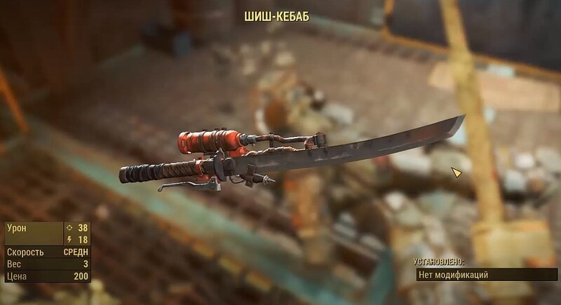 Это легендарный Клинок революционера с повышенным физическим уроном. Благодаря необычному металлу, который использовался для изготовления, оружие также наносит радиационный урон. Лезвие невозможно сделать зазубренным. Этот меч можно получить за выполнение задания «Позолоченный кузнечик», которое выдается на кладбище Норт-Энда.
