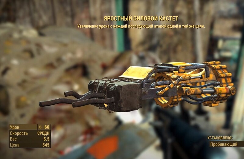 Обычный силовой кастет, который подвергся апгрейду с использованием арматуры и железобетонного блока. Оружие эффективно в том числе для итаки в режиме скрытности — с его помощью можно, не привлекая внимания, нейтрализовать большое количество среднеуровневых противников. Найти уникальный Яростный силовой кастет можно в локации Бостон-Коммон, выбив из супермутанта по имени Лебедь. Противник очень сильный, поэтому расправляться с ним лучше при помощи гранат и коктейлей Молотова.