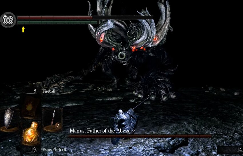 Босс может долго не использовать магию, но иногда использует ее очень часто. Кристальные копья хорошо причиняют ущерб, что позволяет игроку победить Мануса. Он использует хитрое заклинание – запускает магические шары, они возвращаются и ударяют нас в спину. Нужно скинуть таргет и повернуться назад, чтобы защититься от шаров. Однако можно использовать подвеску. В общем она не слишком нужна. Босс вновь совершает комбинированный удар, но мы ударяем ему по руке, он отвечает. Теперь у Отца Бездны остается только один шот.