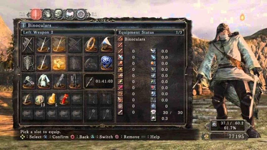 После зачистки территории нужно набрать порядка 30 душ и бежать к Маглину. Вначале у него не будет ничего нужного, кроме Щита с орлом. Если приобрести у него вещей на 1000 душ, то Маглин покажет другие товары. Берем, что понравилось, отправляемся к костру, и обнаруживаем, что появился сет Элитного рыцаря – броня. Еще можно купить сет Алвы Путешественника. Он легкий и довольно крутой, хотя стоит дорого. Также у Маглина существует маленькая тайна: елси к нему подойти совсем без душ, то он пожертвует в пользу нас и подарит сет Ауроса. Это легкий хороший сет, но не всем нравится.