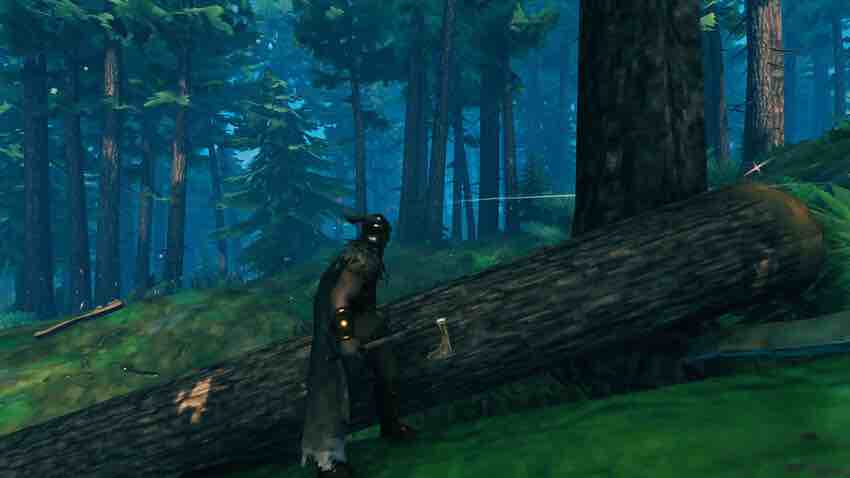 В первую очередь выбираем рядом стоящие деревья. Таким образом мы рубим 2 дерева вместо одного. Эта механика действует и на лежащие бревна, и на оставшиеся пеньки. Рубим деревья таким образом, чтобы стволы падали на другие деревья, нанося урон. После того, как срубили дерево, не сразу бросаемся его разбирать, а рубим еще рядом стоящие деревья, которые должны упасть на поврежденные деревья или бревна. Эти действия экономят запас прочности вашего топора. И мы можем быстро добывать древесину.