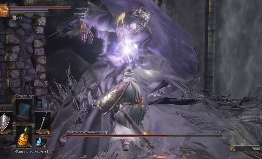 Также рекомендуется переключиться на какое-нибудь быстрое оружие, так как от заклинаний будет очень слабый эффект. Есть шанс отправиться к костру. Босс имеет сильную уязвимость к физическому ущербу и разрыву. Также он сильно уязвим к электричеству и яду. После победы над боссом за первое прохождение вы получите 8 тысяч душ и душу Знатока кристальных чар.