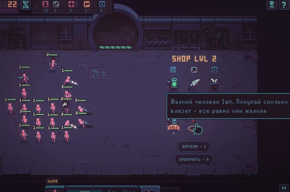В начале игры вам будет выделена небольшая группа людей с низкоуровневым снаряжением, но чтобы пройти через более сложные подземелья, вам придется потрудиться, чтобы усилить свою армию. К счастью, на каждом этаже подземелья есть большое количество комнат, где можно купить новое оружие и воинов. В основном, новоприобретенные люди слабы и бесполезны, но в зависимости от того, какое снаряжение вы им оденете, их статистика значительно изменится, а также они приобретут определенные классы. Например, человек со щитом станет танком, а человек с мечом — мечником.