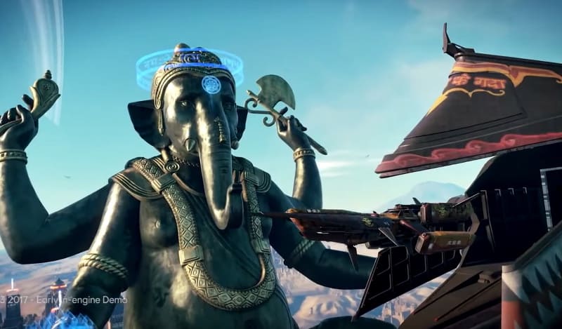 Ещё в 2017 году разработчики показывали нам возможности движка игры. Для этого они сначала навели камеру на персонажа, стоящего на вершине золочёного купола — одного из местных строений. Затем постепенно начали камеру отдалять. Тут же становится понятно, что купол — это часть огромной фигуры с лицом слона и четырьмя руками — явная отсылка к буддизму.