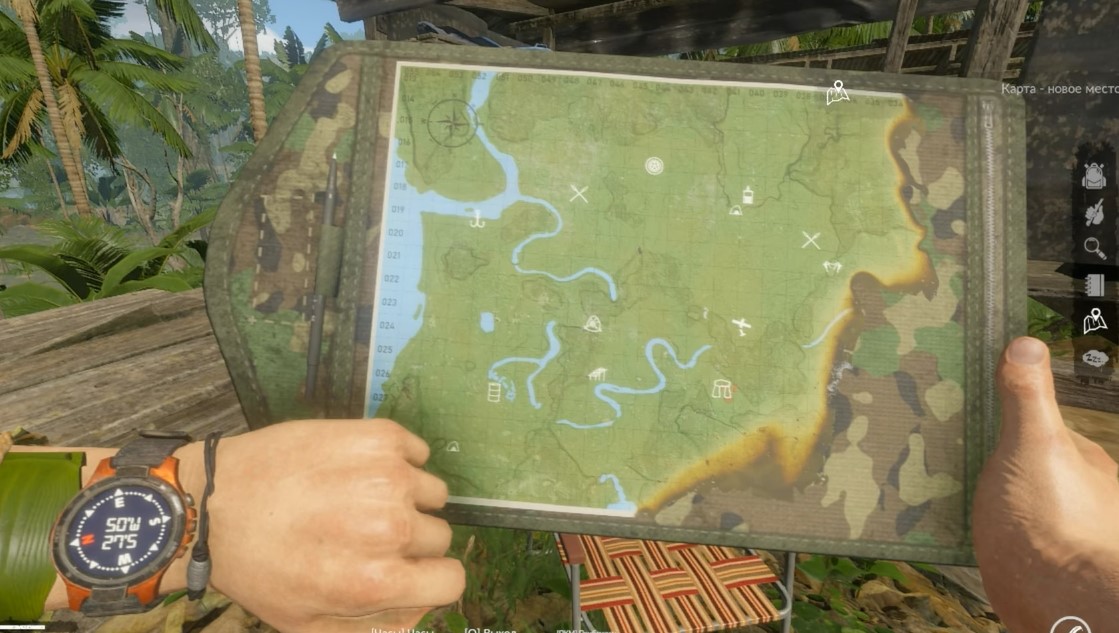 Один из важнейших навыков для успешного выживания в игре Green Hell – умение определять координаты, искать их на карте относительно своего месторасположения. Чтобы начать использовать координаты, нужно зайти в часы, колесиком мыши прокрутить несколько раз, найти компас. На нем будут написаны числа с буквами, которые и обозначают координаты расположения главного героя.