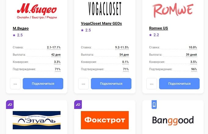 Сервис предоставляет участникам системы удобный каталог офферов и партнерских программ, а также целый набор необходимых для полноценной работы инструментов: автобаннер, скидки и купоны, генератор партнерских ссылок, приложения.