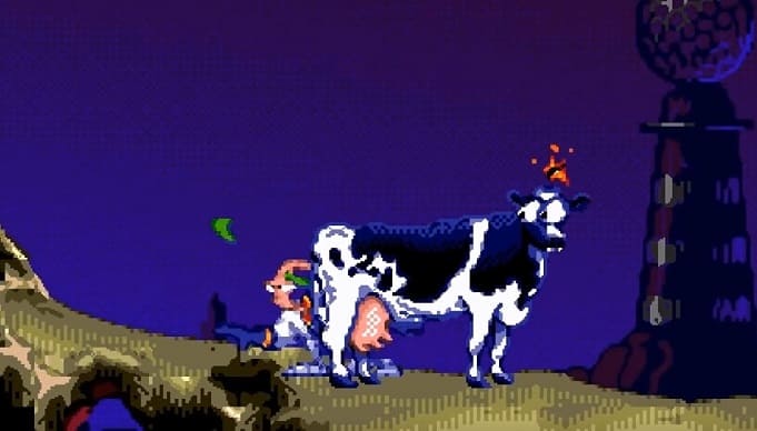 В новой игре, наш герой обзавелся новыми типами оружия и получил в помощники Слизь (которую я считал одним из самых бесполезных нововведений), а геймплей стал ещё более разнообразным, как и уровни. Мне больше всего запомнились этапы с доставкой коров в хлев, где летали НЛО и постоянно мешали заниматься своими делами, плавное путешествие в костюме слепой саламандры по коровьему кишечнику под музыку Бетховена – просто ОГОНЬ, беготня по продуктам питания на кухне и борьба с летающей солонкой, а также повторяющийся уровень с ловлей щенят с помощью батута из зефира.