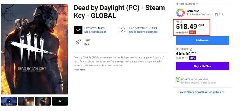 Выберем Dead by Daylight и посмотрим, что там по ценам. Итак, этот продавец готов отдать игру за 518 рублей, либо вы можете приобрести её за 466, если у вас есть активная подписка Plus. Эта подписка даёт возможность получать бесплатную игру каждый месяц, быстрее узнавать о крутых скидках и покупать игры для разных платформ.