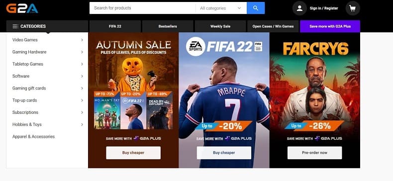 Ещё магазин дешевых игр, на котором можно взять дешевые ключи стим – G2a.com. Он полностью англоязычный, однако интуитивно понятный. Только не забудьте выставить цены в русских рублях (у меня уже по умолчанию включено, хоть и не нахожусь в аккаунте). Здесь ключи приобретаются напрямую у продавцов.