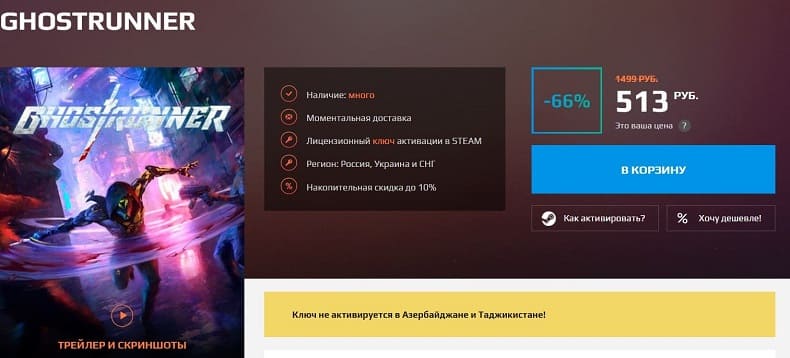 Давайте возьмём в пример одну игру – это киберпанковский паркур-экшен Ghostrunner выпущенный в октябре 2020-го года. В стиме тот стоит сейчас 1500 рублей, а на других площадках ключи стим к этой игре можно купить за 599 рублей или даже за 513р. Дешево – экономия в 63%. Естественно, это не единственный пример. Впрочем, вы и сами можете ознакомиться с ценами на игры в этих магазинах, перейдя по ссылкам в описании или в закрепленном комментарии.