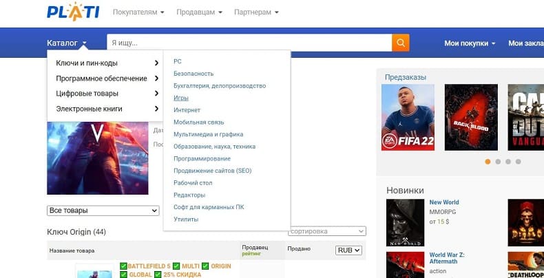 Plati.ru – это сайт, на котором торгуют не только играми. Тут полно других цифровых товаров и услуг. Но нас не они интересуют, правда ведь? Итак, перед нами алфавитный список игр. Если неудобно, тогда можно искать проекты по жанрам.