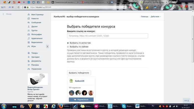 Достаточно указать ссылку на конкурс, условие и нажать на кнопку – выбрать победителя.